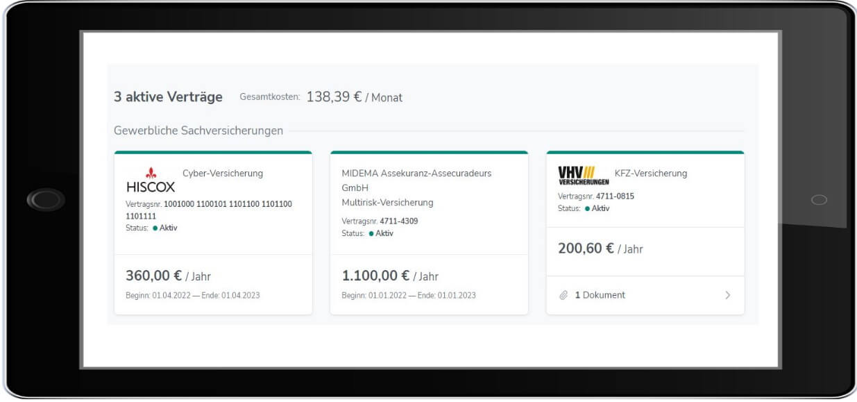 Ihr persönliches Kundenportal bietet ihnen eine Übersicht aller Verträge. Neue Dokumente spielen wir für Sie direkt in die Übersicht ein, so haben Sie immer eine aktuelle Übersicht.